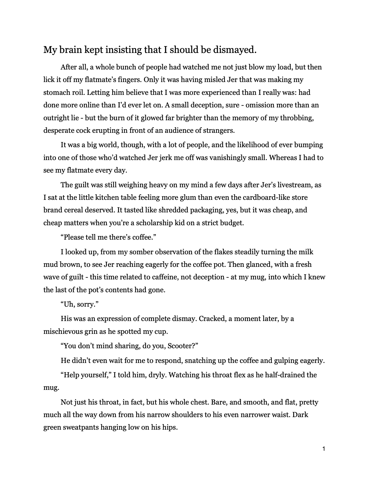 What started as a favor to help his flatmate sell clothes online, rapidly turned into a live sex show with college swimmer Scooter the drooling, inexperienced star. After all that, he'd have to be crazy to say yes to a second livestream. So why is saying no so difficult?